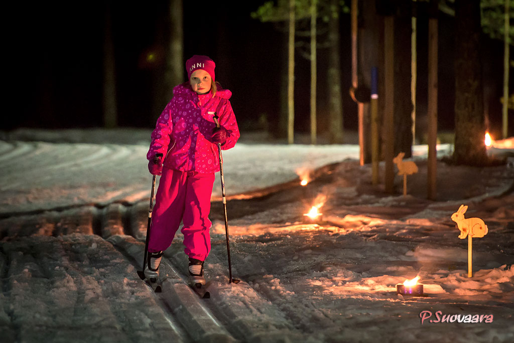 Jätkänkynttilät reunustavat latua valaisten sen hennolla kajollaan. Reitti huipentuu Roumion Karvahuuli-nimiselle Laavulle kohoten rinnettä ylös. Lepattavat ulkotulet muodostavat rinteeseen upean käytävän, joka houkuttelee ylös kalliolla loimottavalle nuotiolle.